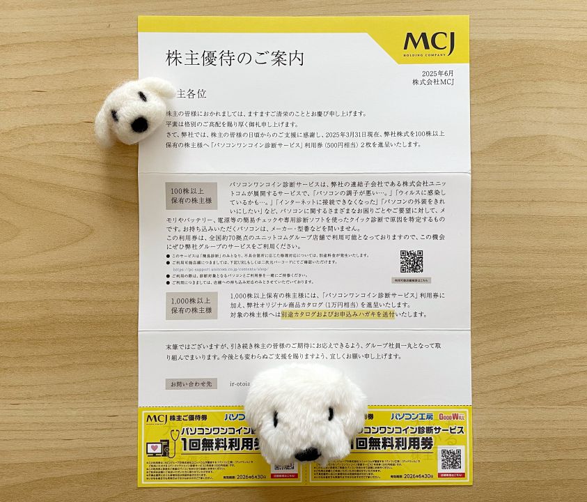| 1,000株以上 | 「パソコンワンコイン診断サービス」利用券 2枚 + 10,000円相当のオリジナルカタログ |