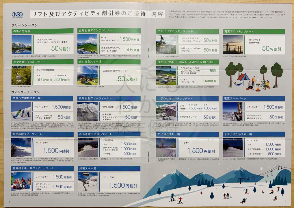 | 紙のチケット | ・日本スキー場開発が運営するリフト利用 割引券3枚 (1枚で5名様までご利用可能) ・那須高原 TOWA ピュアコテージ平日限定宿泊 ご招待券2枚(1枚2名様までご利用可能) | ・日本スキー場開発が運営するリフト利用割引券 3枚 (1枚で5名様までご利用可能) |