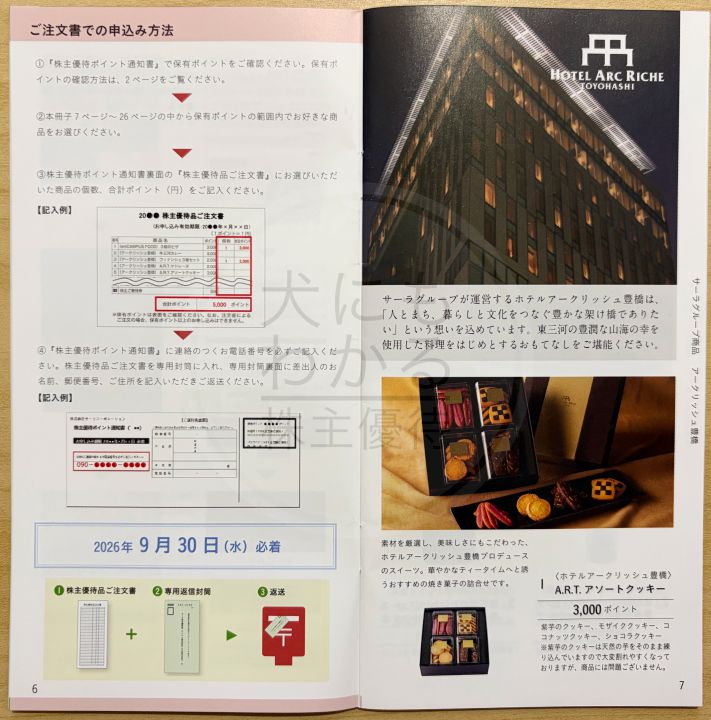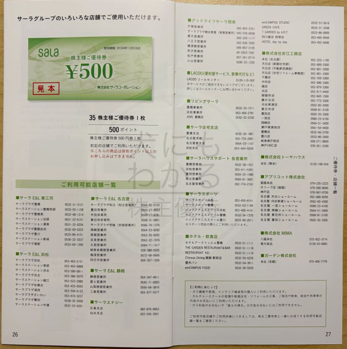 株式会社サーラコーポレーションの株主優待。自社グループ店舗で使える優待券や様々な商品が掲載されているカタログです。